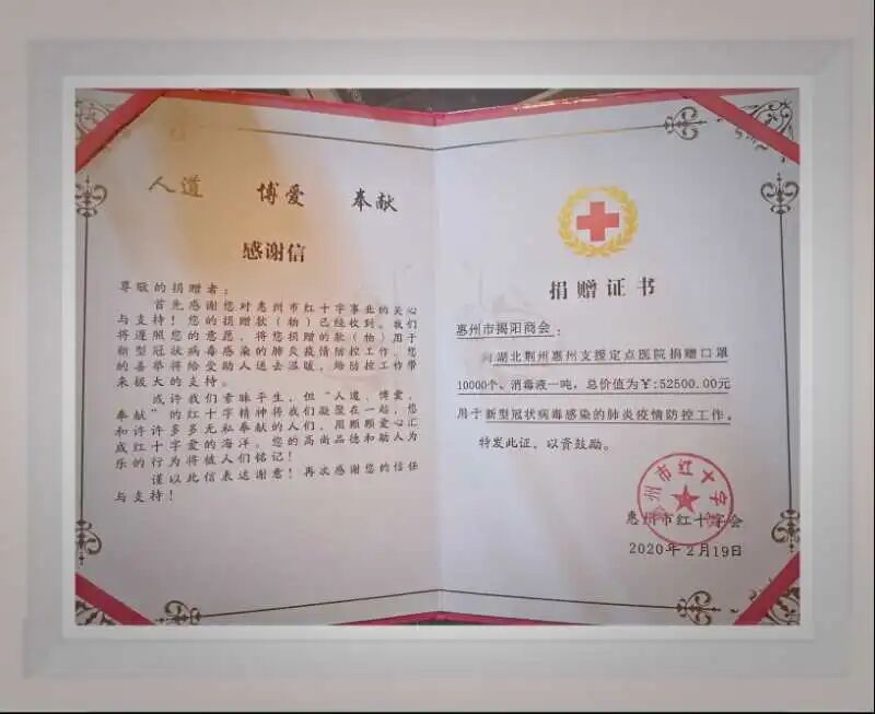 自防疫战役打响以来,广东嘉源公司林锐嘉董事长积极响应国家号召,捐资捐物。为了使物资和善款能够及时有效交到一线抗疫英雄手里,我们选择了通过联合志同道合的兄弟单位,通过权威机构定向捐资捐物,我们通过HT48爱心小组/惠州市青年企业家联合会/惠州市揭阳商会等组织,分别为公羊慈善基金会/韩红公益慈善基金会/惠州市红十字会等定向捐赠防护口罩及84#消毒液(小组新闻报导有有详细报告)。